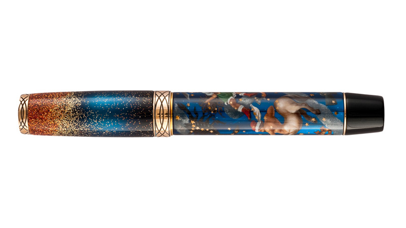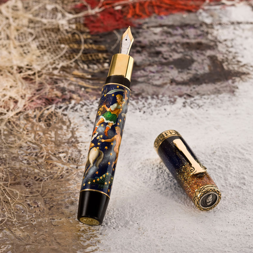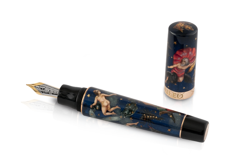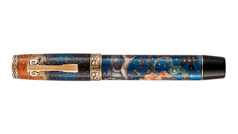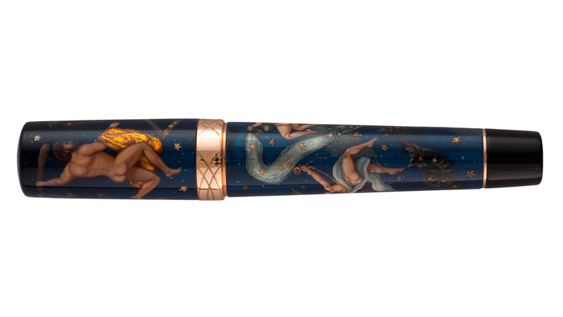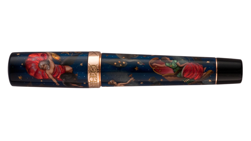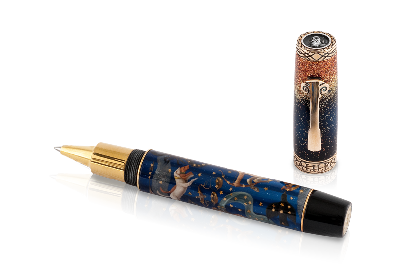 OThe hand painted midnight navy cap radiates color from cosmic orange to celestial gold. Atop the cap lies a sterling silver three-dimensional portrait of Galileo gazing towards the heavens. The clip modeled after parts of his telescope, directs the eye towards ‘Galileo’, which is emblazoned into the band at the bottom of the cap. A unique, hand painted, mother of pearl barrel marries images of celestial constellations along with an artistic interpretation of their symbolism. The dark night sky provides exceptional contrast for these luminescent figures.