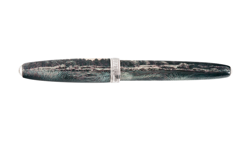 This grand writing instrument is hand painted with a view of Muir’s beloved Yosemite, portrayed in gray-scale. The painting, along the full length of the pen, captures a breathtaking panoramic view of the valley.