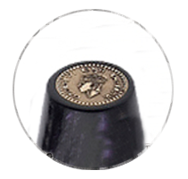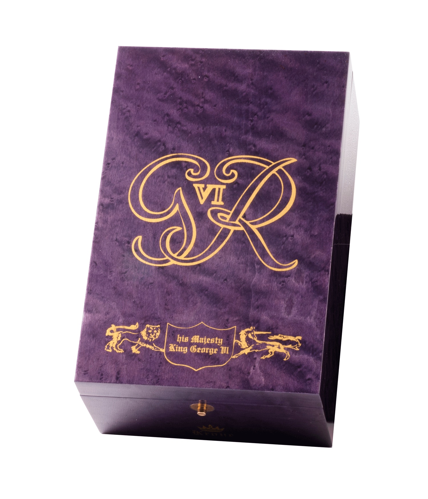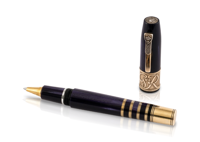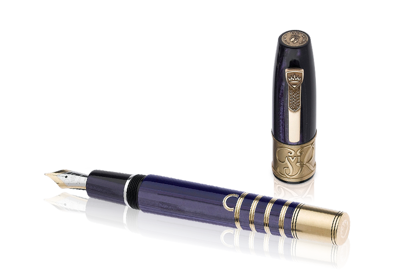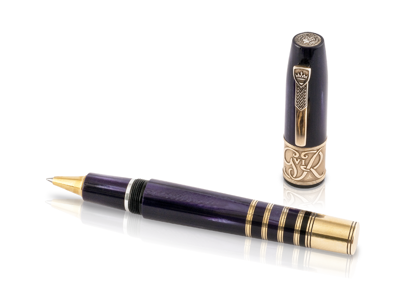 The cap and barrel are made of royal purple Italian celluloid. The base of the cap is a decorated bronze band, etched with the GviR crest symbolizing in Latin ‘George Rey VI’ (King George VI). The top of the cap is adorned with a replicated version of a coin issued to celebrate the coronation of King George VI. Unique bronze banding at base of barrel is symbolic of the King’s Royal uniform.