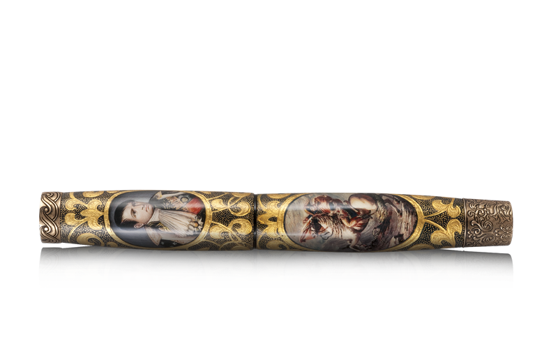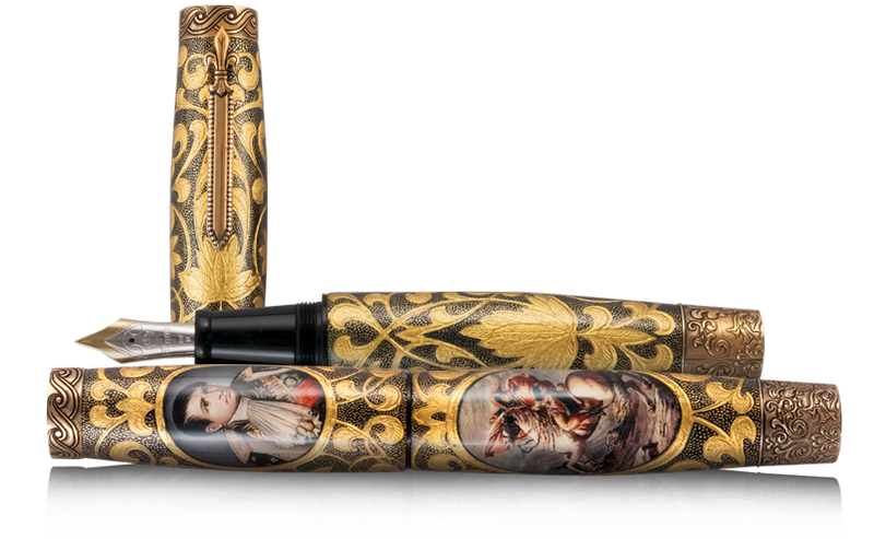 The cap and barrel feature highly detailed hand painted portraits framed with gold leaf fleur-de-lis finely sculpted, using Krone’s signature micro-chiseling process. Atop the clip is an ornate bronze fleur-de-lis.