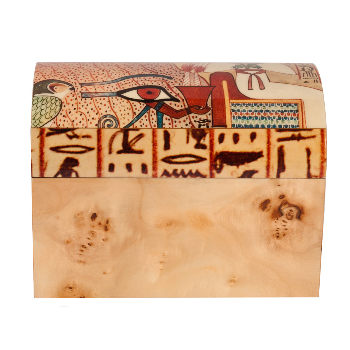 The richly detailed barrel is painted with a meticulous Egyptian pattern, featuring royal, crimson, emerald and golden colors.